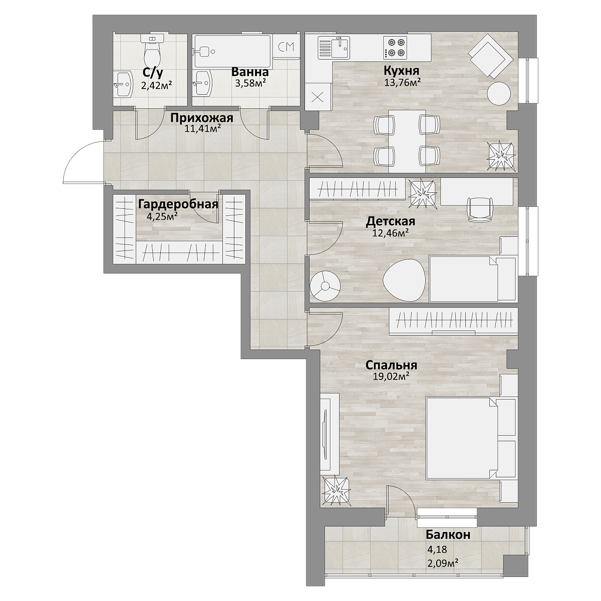 2 комнаты, 62.7 м², 13/17 эт