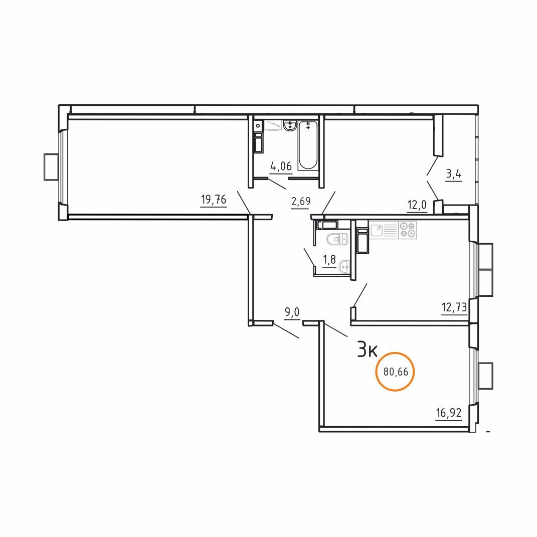 3 комнаты, 80.66 м², 3/17 эт