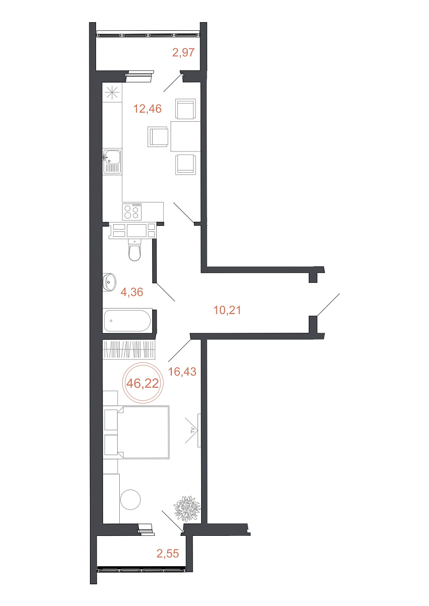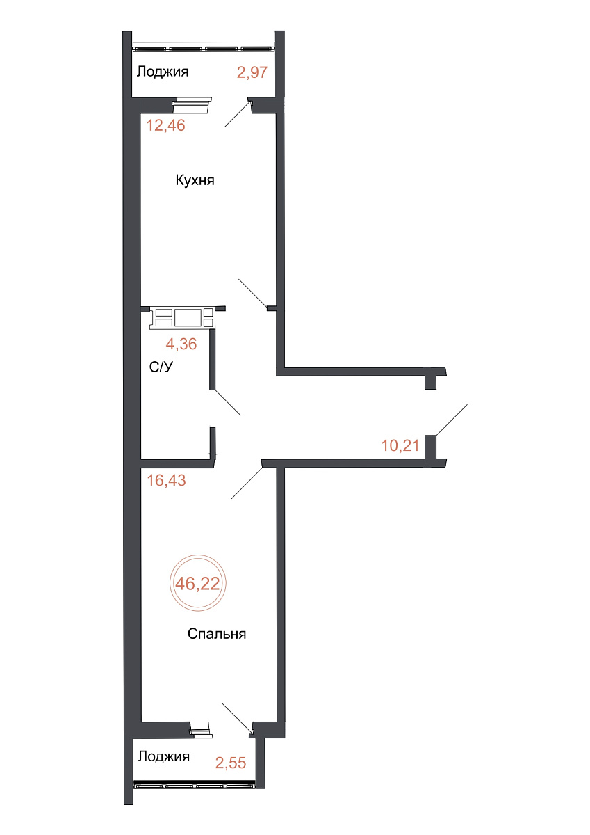 1 комната, 46.22 м², 16/16 эт