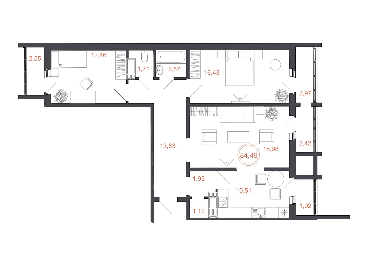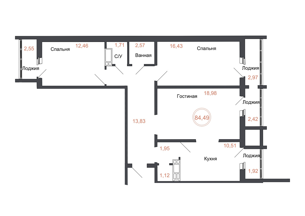 3 комнаты, 84.49 м², 15/16 эт