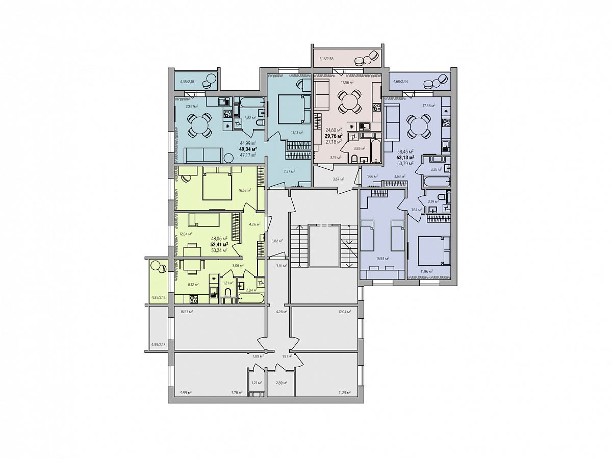 Большая семейная трехкомнатная квартира в ЖК «Атмосфера». Кухня-гостиная с двумя отдельными комнатами. Общая площадь 63,1 кв.м.