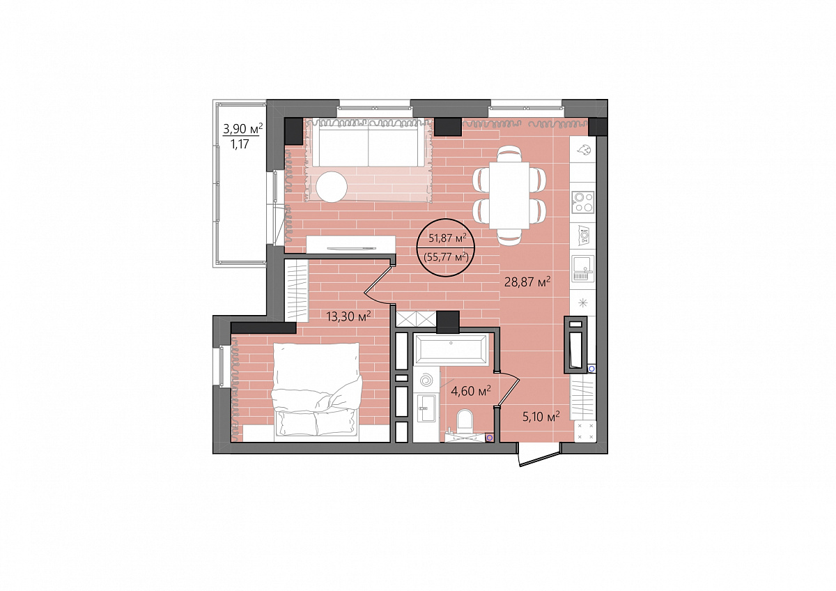2 комнаты, 55.77 м², 3/25 эт