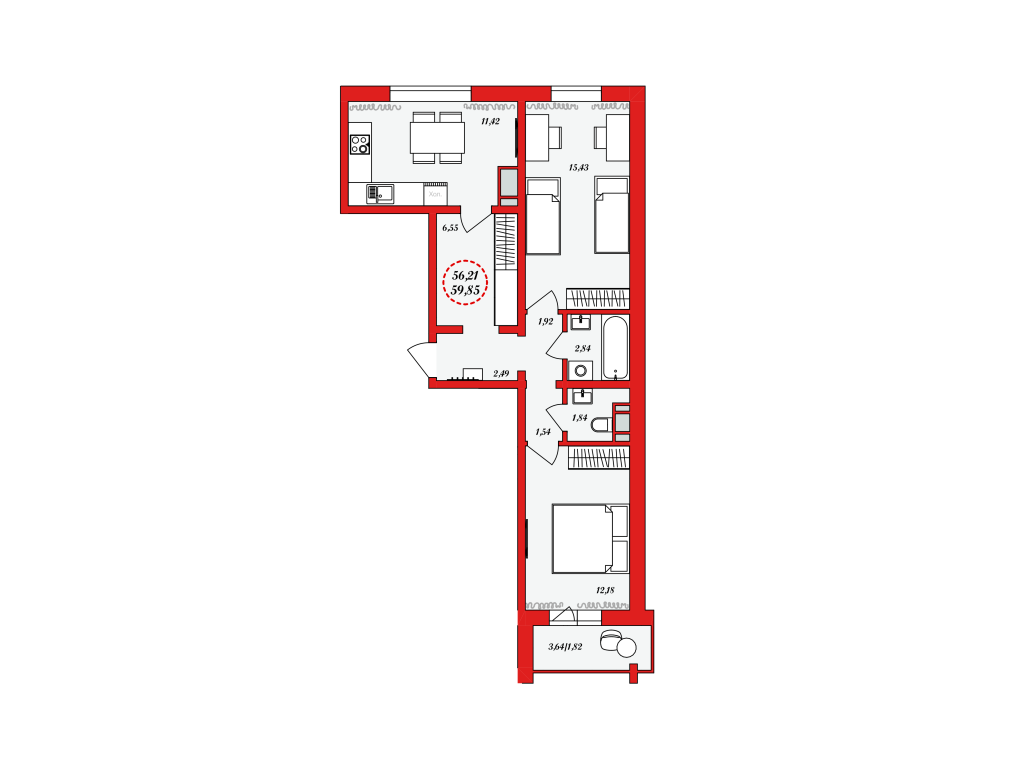 2 комнаты, 59.85 м², 4/8-11 эт эт