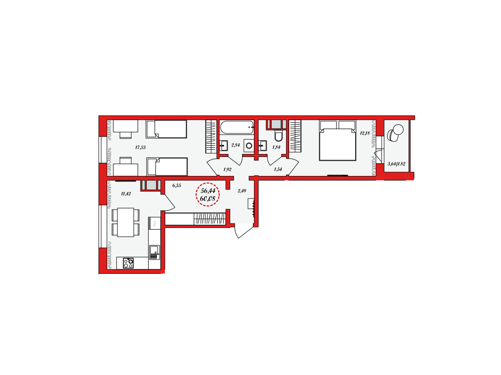 2 комнаты, 60.08 м², 3/8-11 эт эт