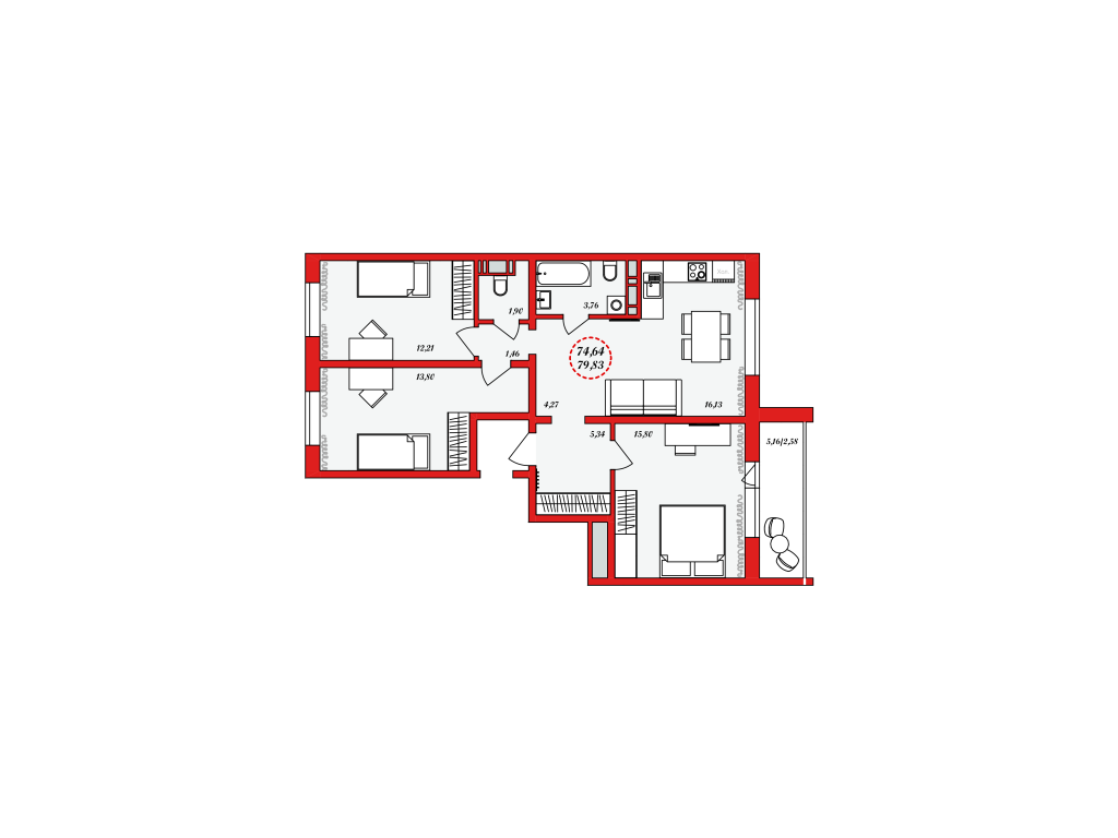 3 комнаты, 79.8 м², 9/8-11 эт эт