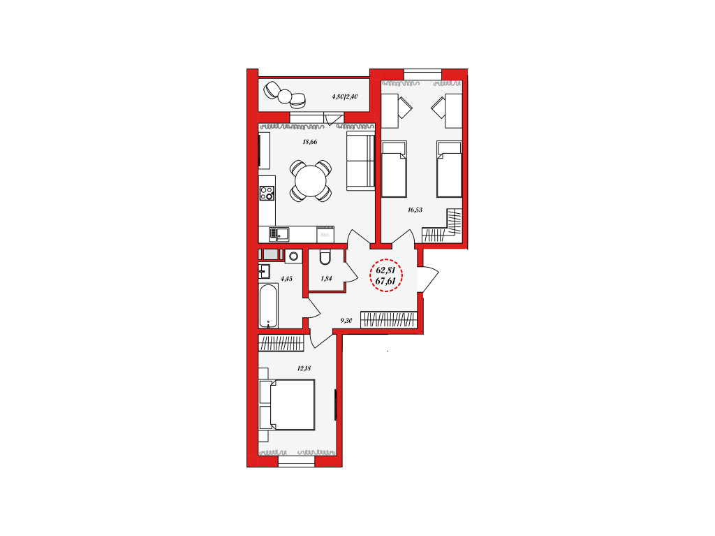 2 комнаты, 67.61 м², 3/8-11 эт эт