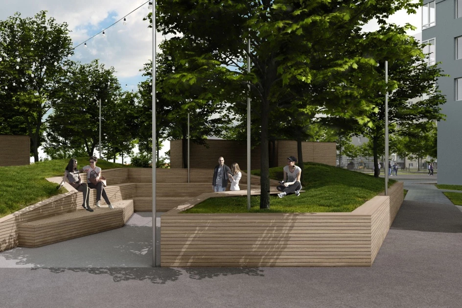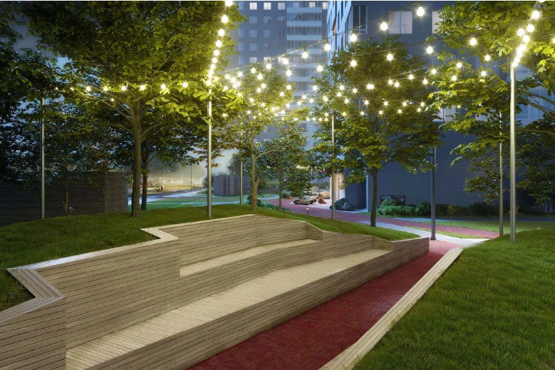 Плюс проекта — индивидуальные дворовые пространства и воплощенная в реальность задумка прогулочной зоны по всему комплексу. Отдыхать, заниматься спортом, играть с детьми можно в любое время суток. Во дворах продумано освещение — иллюминация украшает территорию в вечернее время.