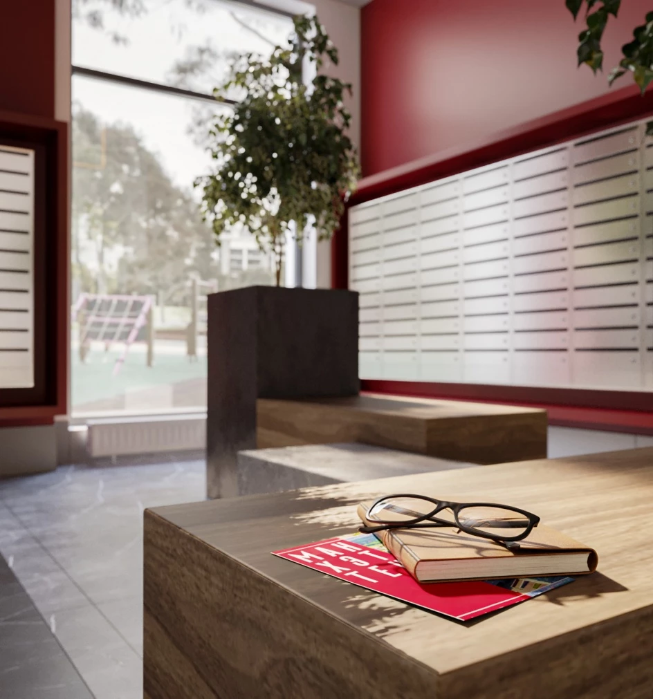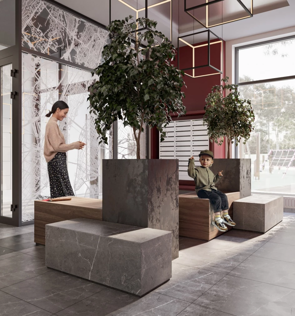 Выходя из квартиры, жители окажутся в комфортной для себя среде. Вестибюли и лестничные пролеты выдержаны в едином стиле проекта, в каждом лобби — зона отдыха, где можно ожидать такси или общаться с соседями. В новой высотке — 4 лифта.