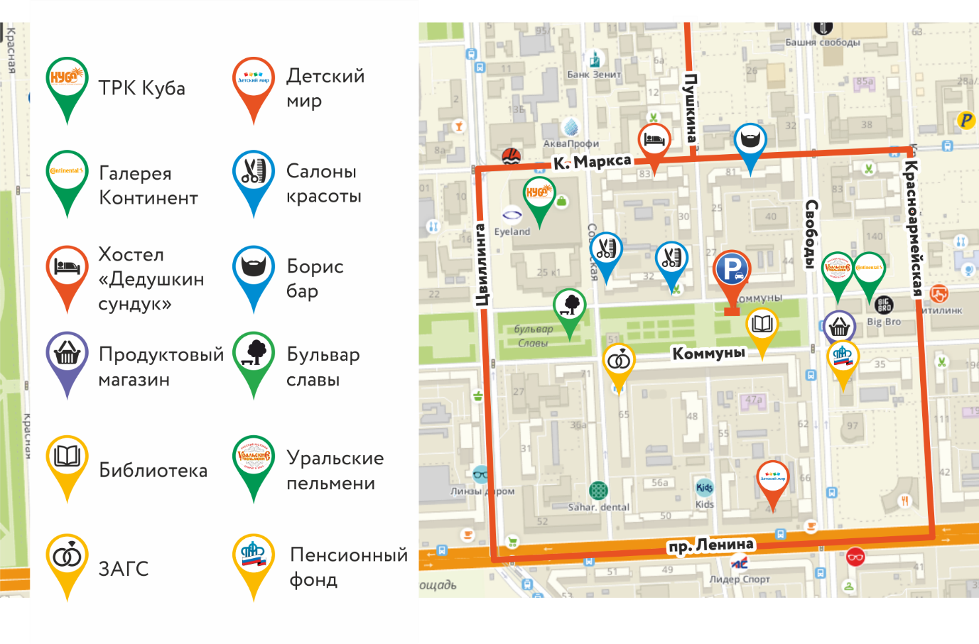 Подъехать к парковке можно со стороны: ул. Коммуны, ул. Цвиллинга, ул. Свободы, ул. К.Маркса, ул. Пушкина.