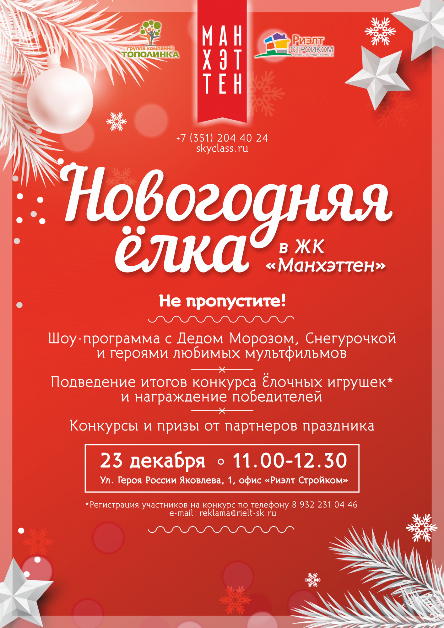 Ждем каждого на празднование самого сказочного праздника в жилом комплексе "Манхэттен", который состоится 23 декабря по адресу Героя Яковлева, 1 с 11.00 до 12.00:30