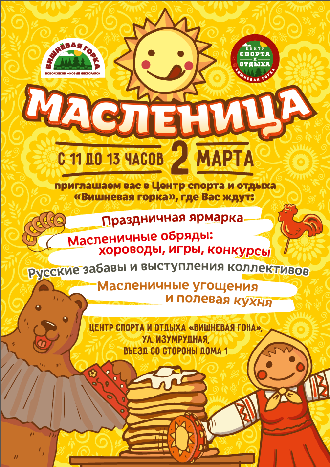 Яркий и солнечный праздник Масленицы символизирует наступление весны, долгожданного тепла и новых надежд. Этот день все стремятся провести в шумной компании веселых друзей и родных, поесть вкусных блинов и поучаствовать в интересных конкурсах. Поэтому, специально для жителей и гостей микрорайонов «Вишневая Горка», «Залесье», «Просторы», «Женева», 02 марта 2019 года состоятся проводы зимы и встреча лета - чудесный праздник "Масленица"!
