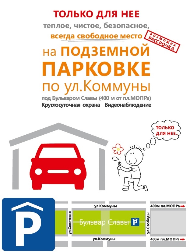 Всегда свободное, теплое, чистое и безопасное место ждет вашу машину на парковке под Бульваром Славы, всего в 400 м. от пл. МОПРа.