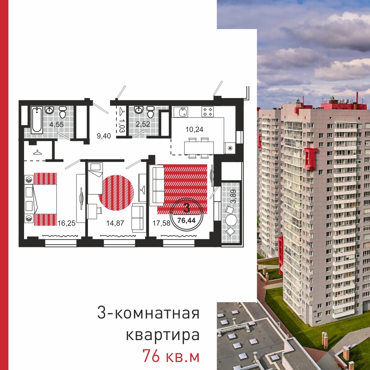 Вторая планировка – это просторная трёхкомнатная квартира 76 кв.м.