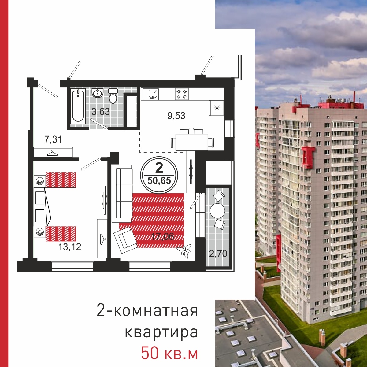 Первая планировка - удобная двухкомнатная квартира 50 кв.м.