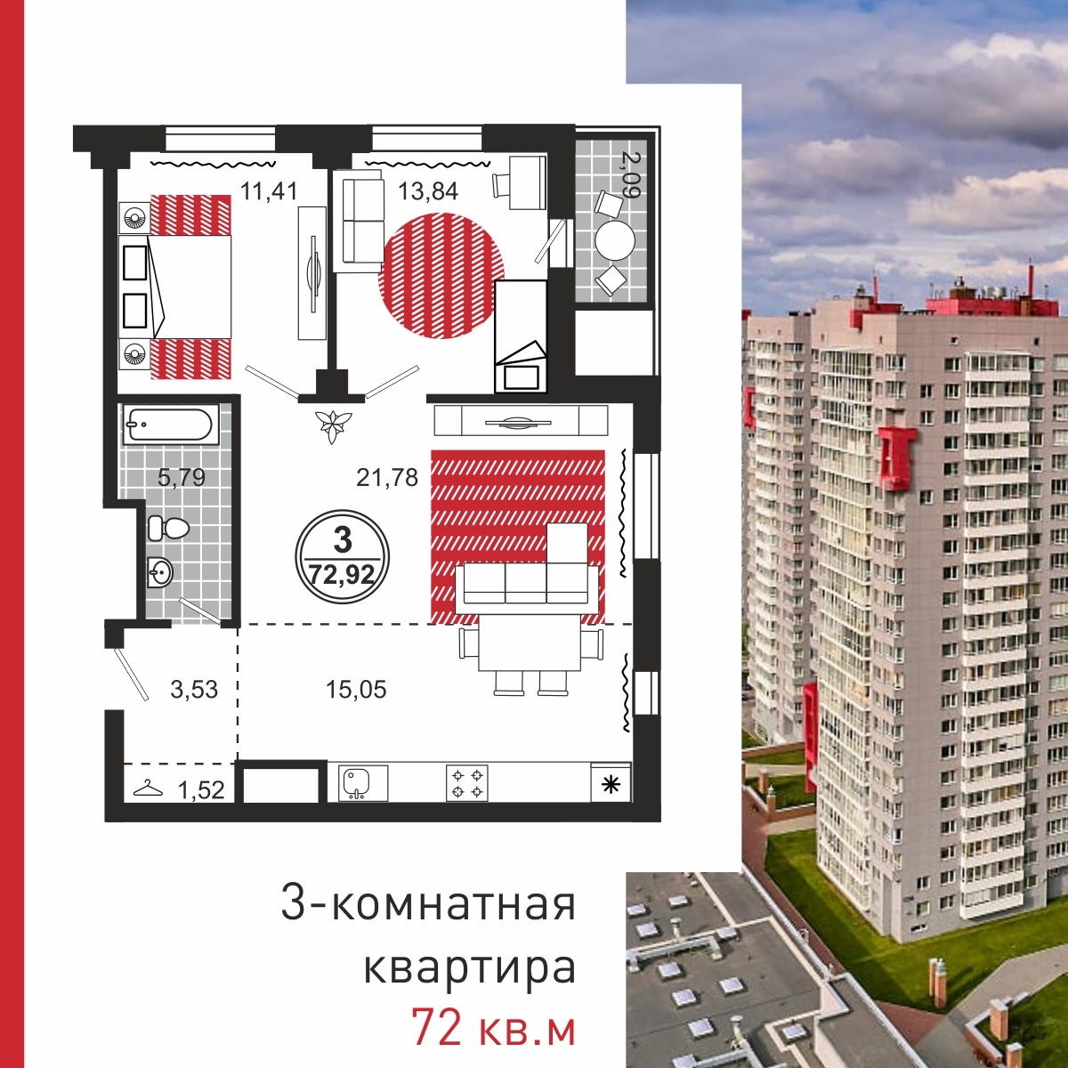 Площадь квартир от 72 кв.м Стоимость от 4 038 070 руб.